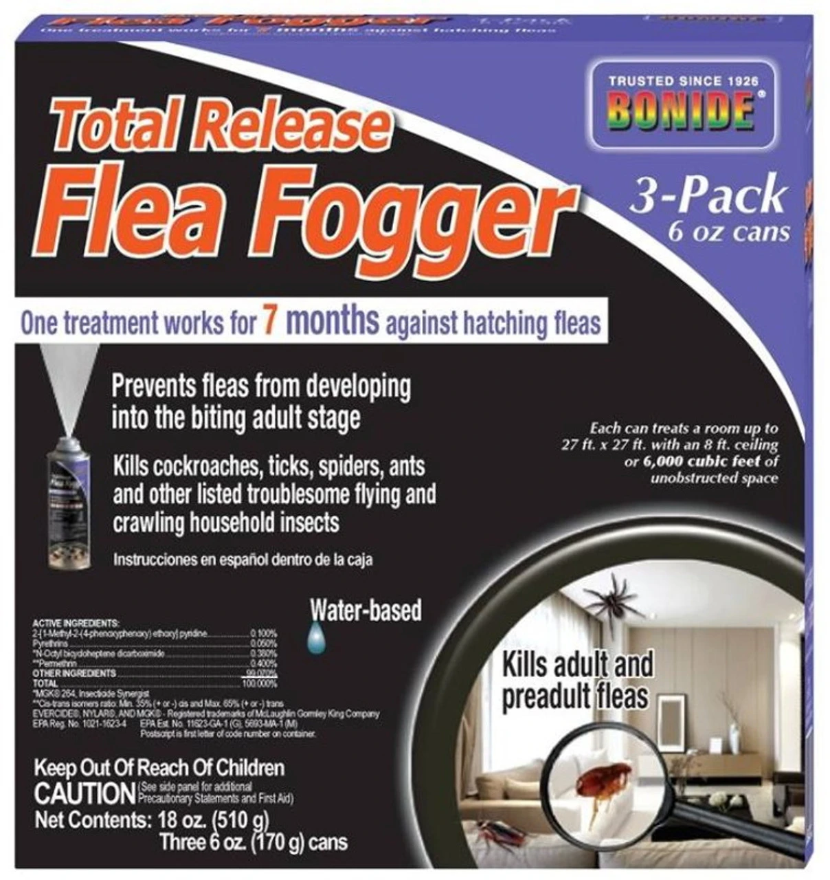A powerful combination of Nylarรยร insect growth regulator, Pyrethrin, Permethrin and MGK 264 provides up to 7 months of insect control. Use in homes, apartments, dorms, condos, attics, basements, kitchens, kennels to control fleas, ticks, roaches, ants, lice, beetles, grain and pantry insects, bees. Simply shake and lock valve for automatic discharge. Each 6 oz can treats 6000 cu-ft, water-based.